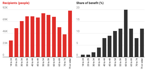 Similarly, older people benefit far more than younger people. People over 60 received 52% of the benefit, while those between 18 and 34 received 4%. That is despite both groups comprising around 29% of the adult population.
